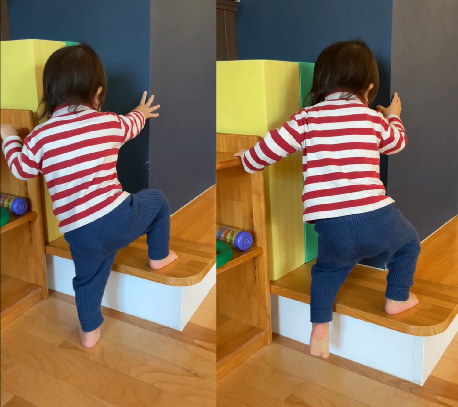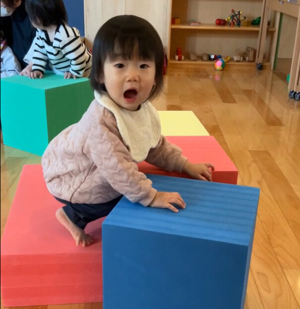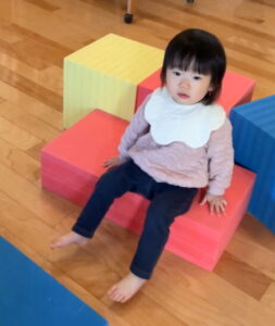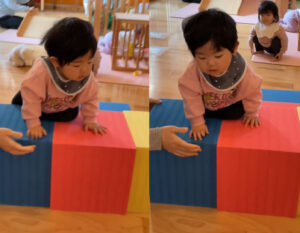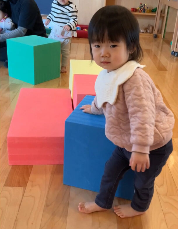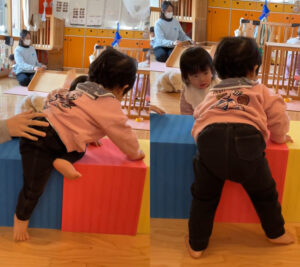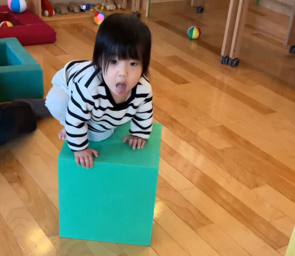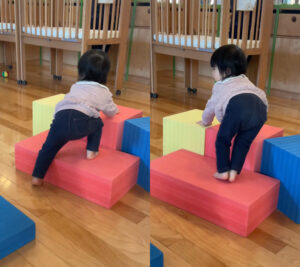 階段のないウレタンブロックに高々と足をかけ、自力で登り切ることができました。