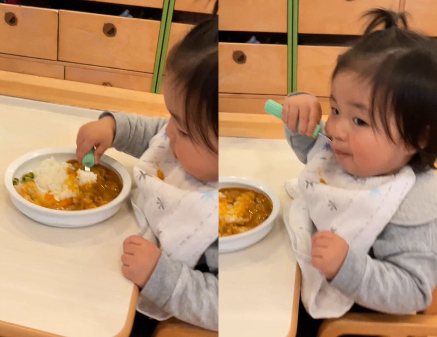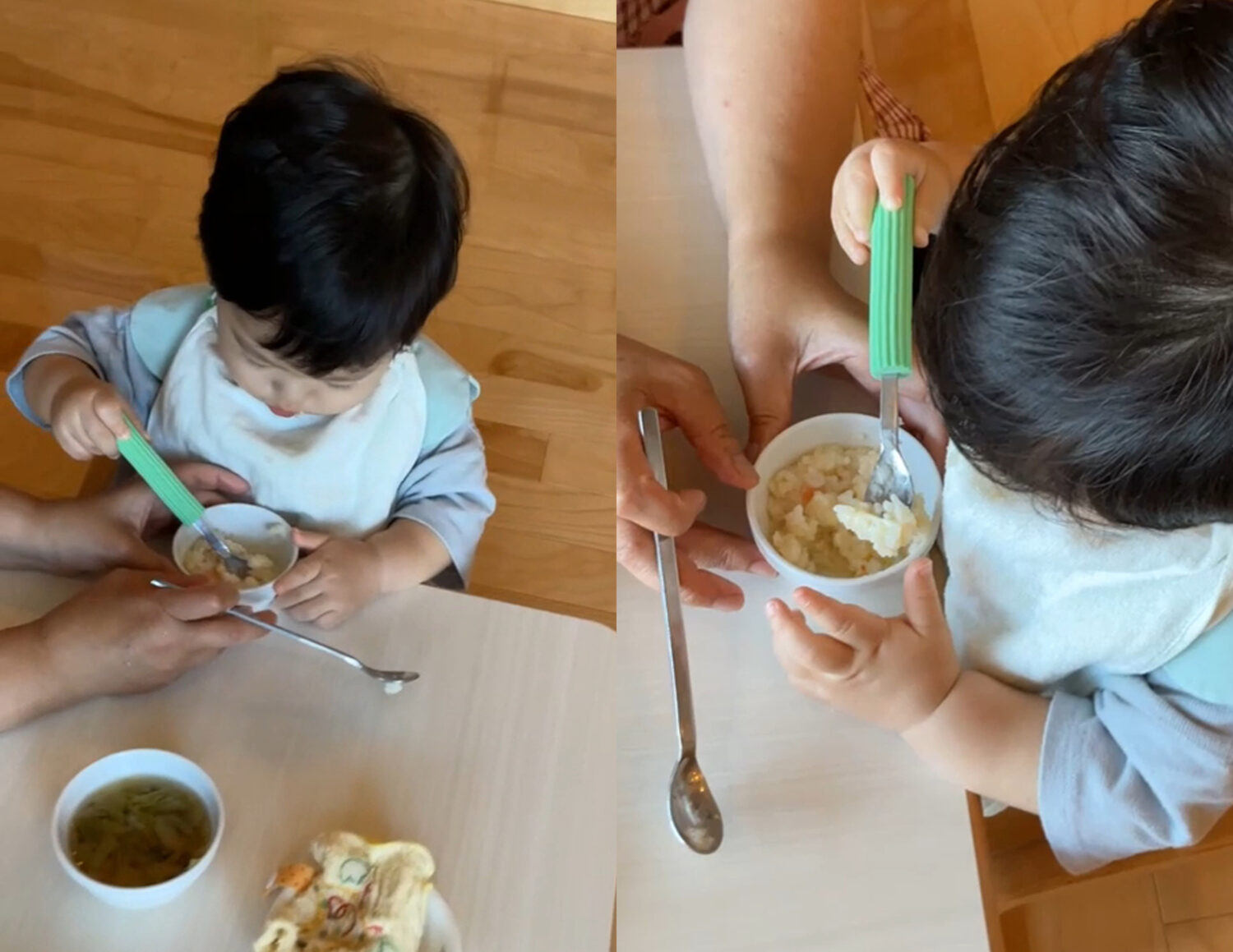 やがて、スプーンで食べ物をすくって自分で口に運べるようになってきました。