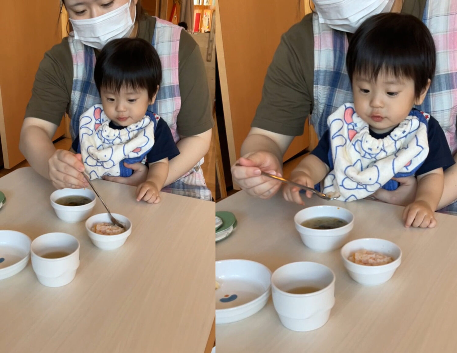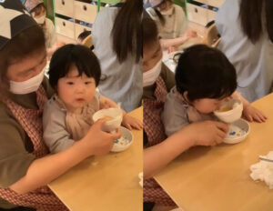 保育者がスプーンを口に押し込むのではなく、子どもが口を開けて「食べたい」という意思を見せた時に口に入れるような配慮に心がけてきました。