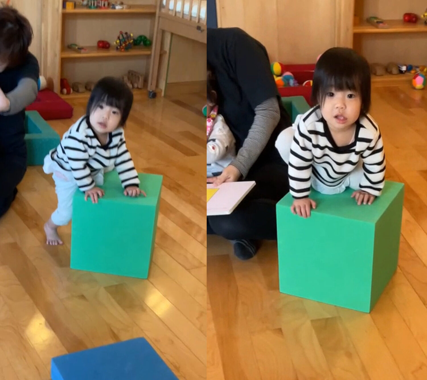 こちらは、横並びのウレタンブロックを乗り越えるミッションに挑戦中!