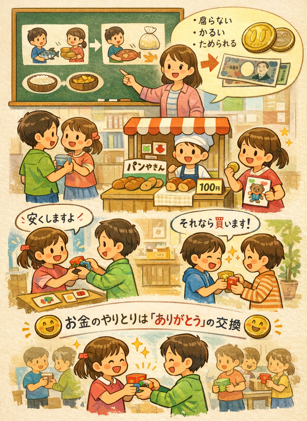 上記のワークショップでは、物々交換からお金が生まれた理由を学んだ後、お店屋さんごっこで「値付け→売買→やりとり」を親子で体験しました。
