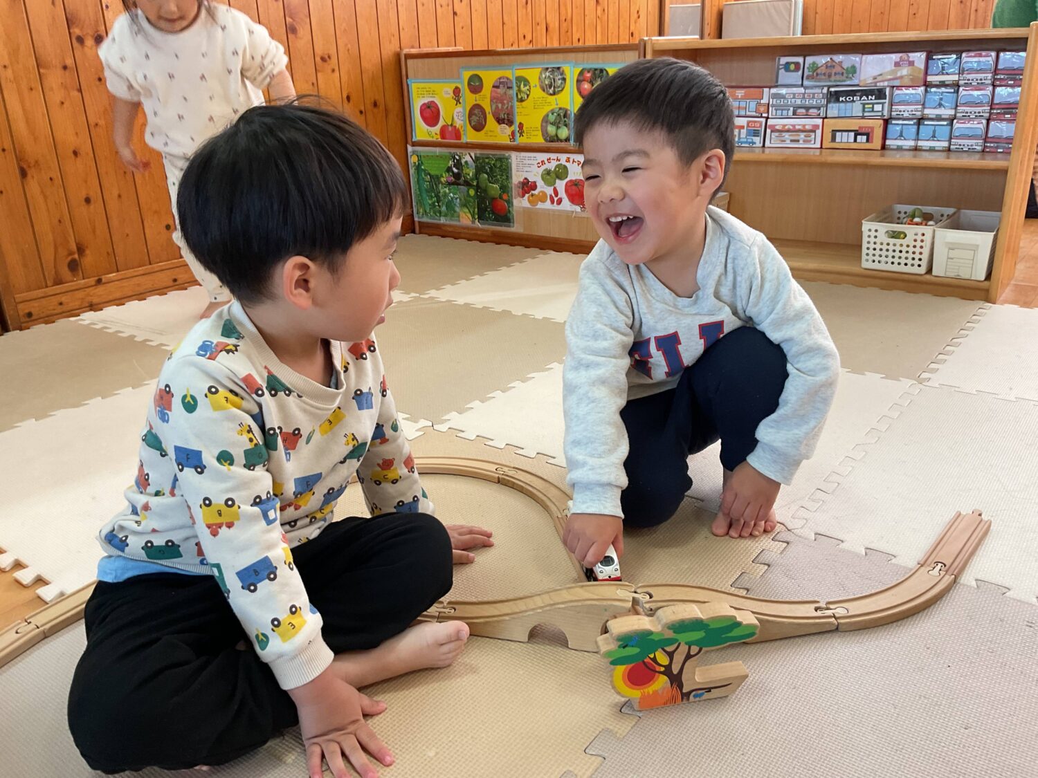 もうすぐ3歳児クラスに進級する子ども達・・・一年前に比べて、より緊密に関わり合って遊ぶ姿が見られるようになりました。