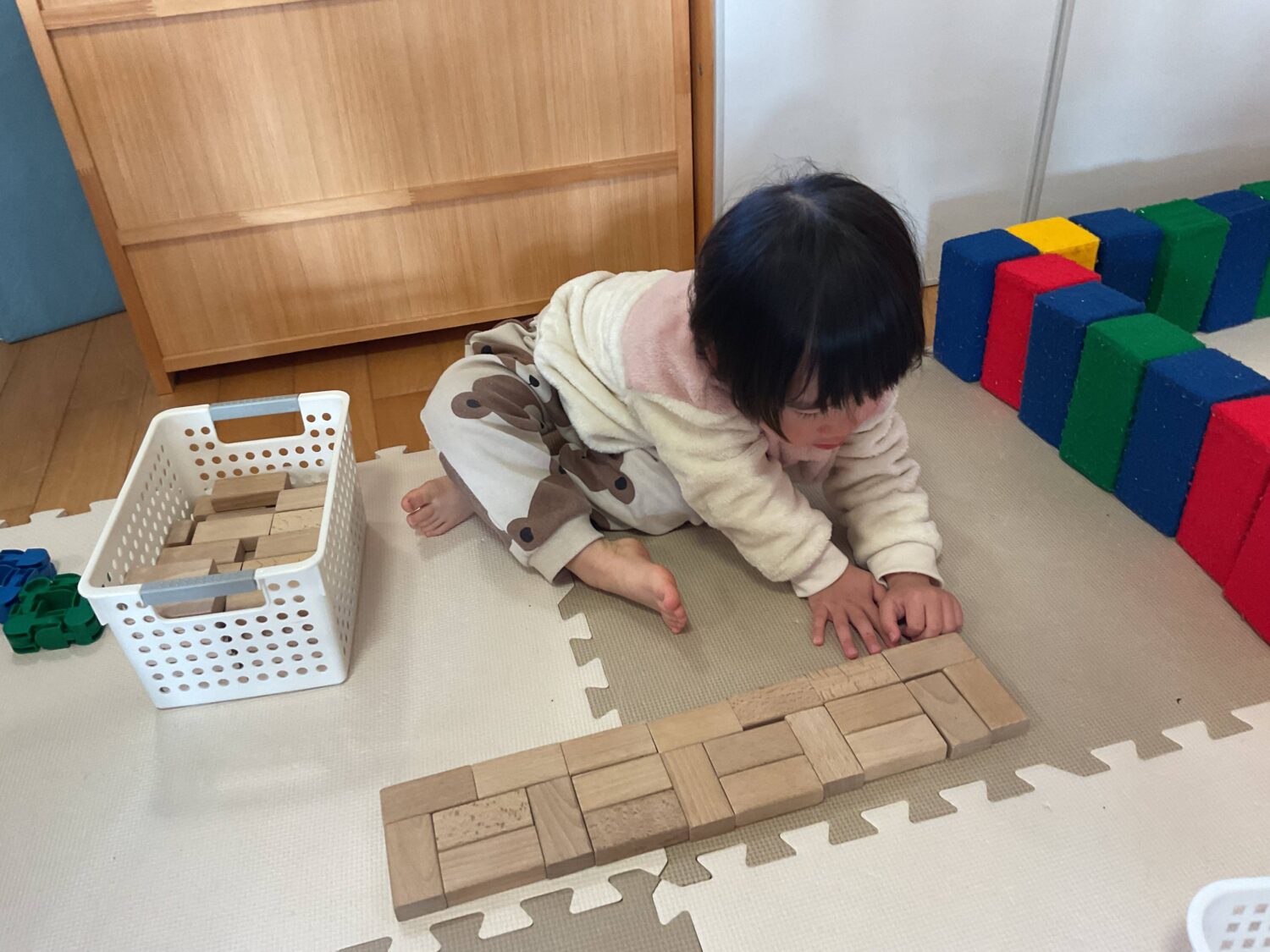 積木の向きや並べ方を考えながら枠のように並べていく姿には、形を見分ける力や、全体をイメージしながら作る力の育ちが感じられます。