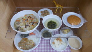 中華丼には、豚小間、人参、白菜、玉ねぎ、きくらげ、中華味、鶏ガラ、薄口、片栗粉を使用しています。餡たっぷりでご飯にしっかりからんで美味しかったです。