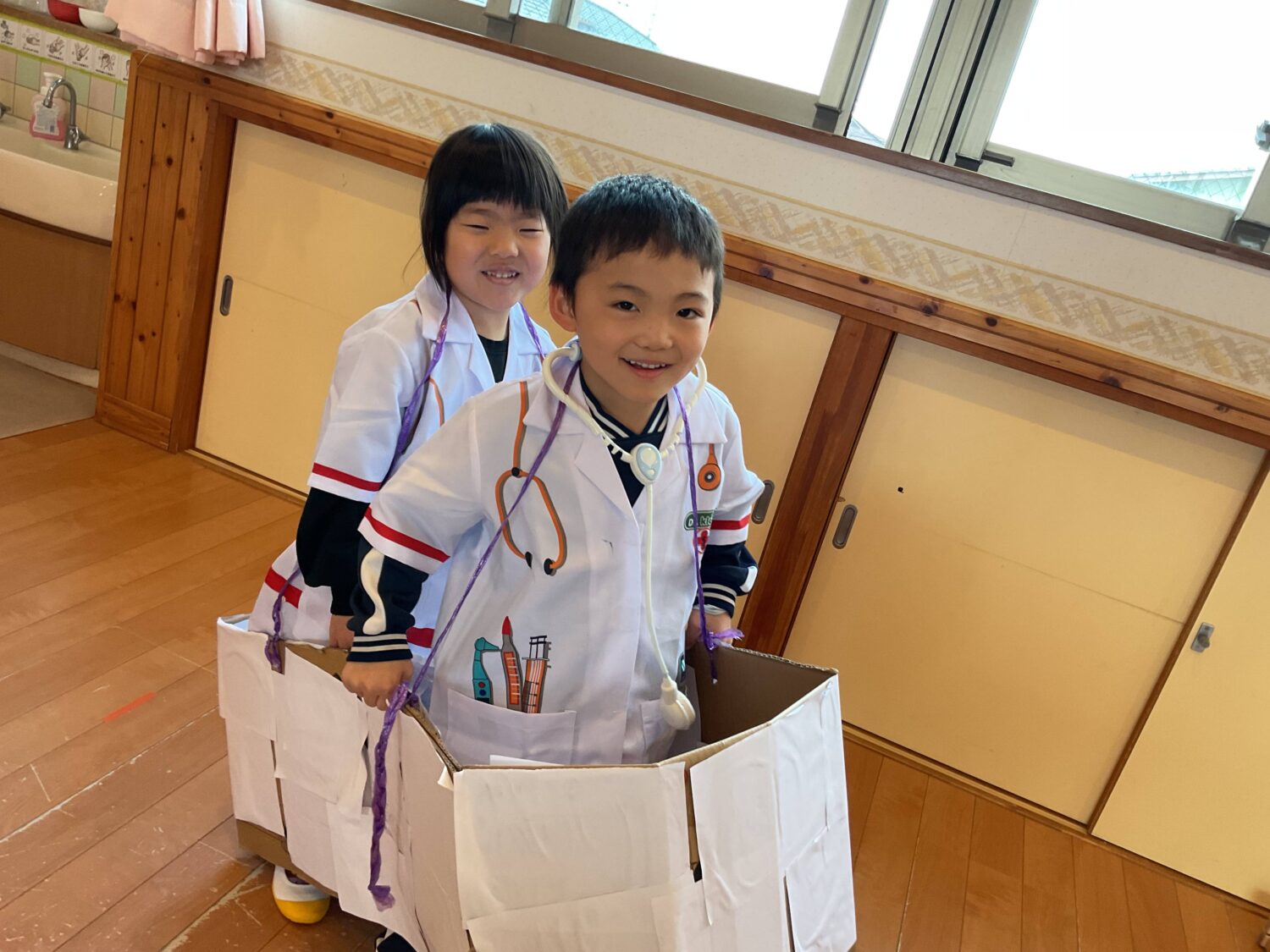 病院と言えば救急車!という事で、先生の手も借りながらダンボールで作る事に。