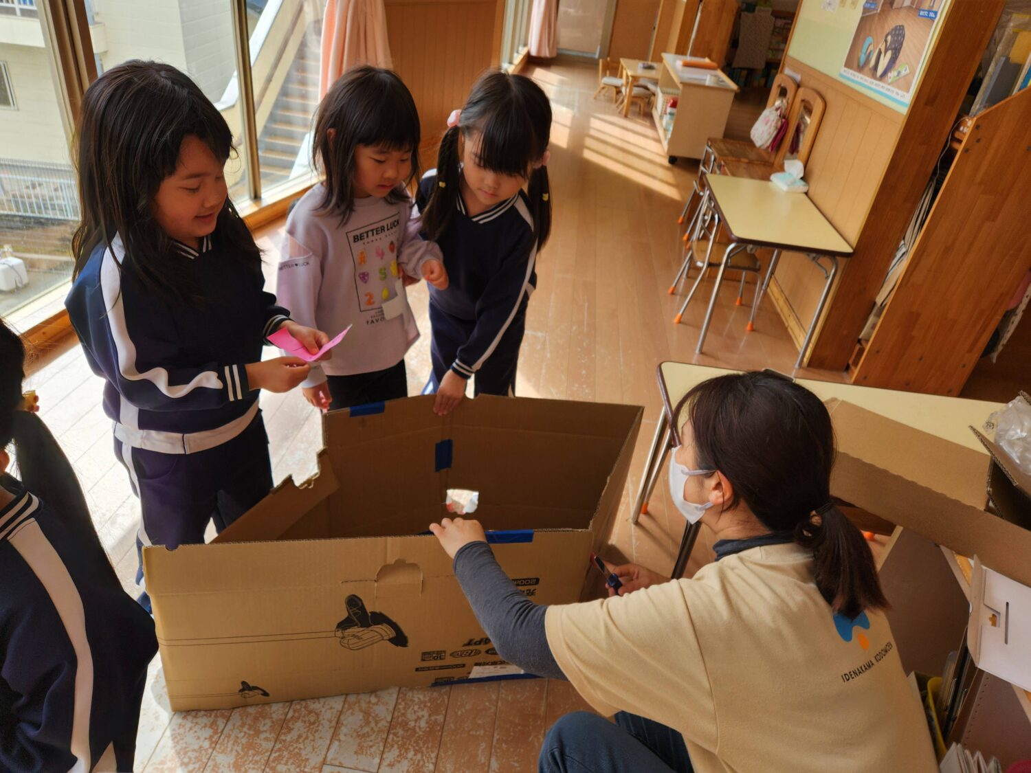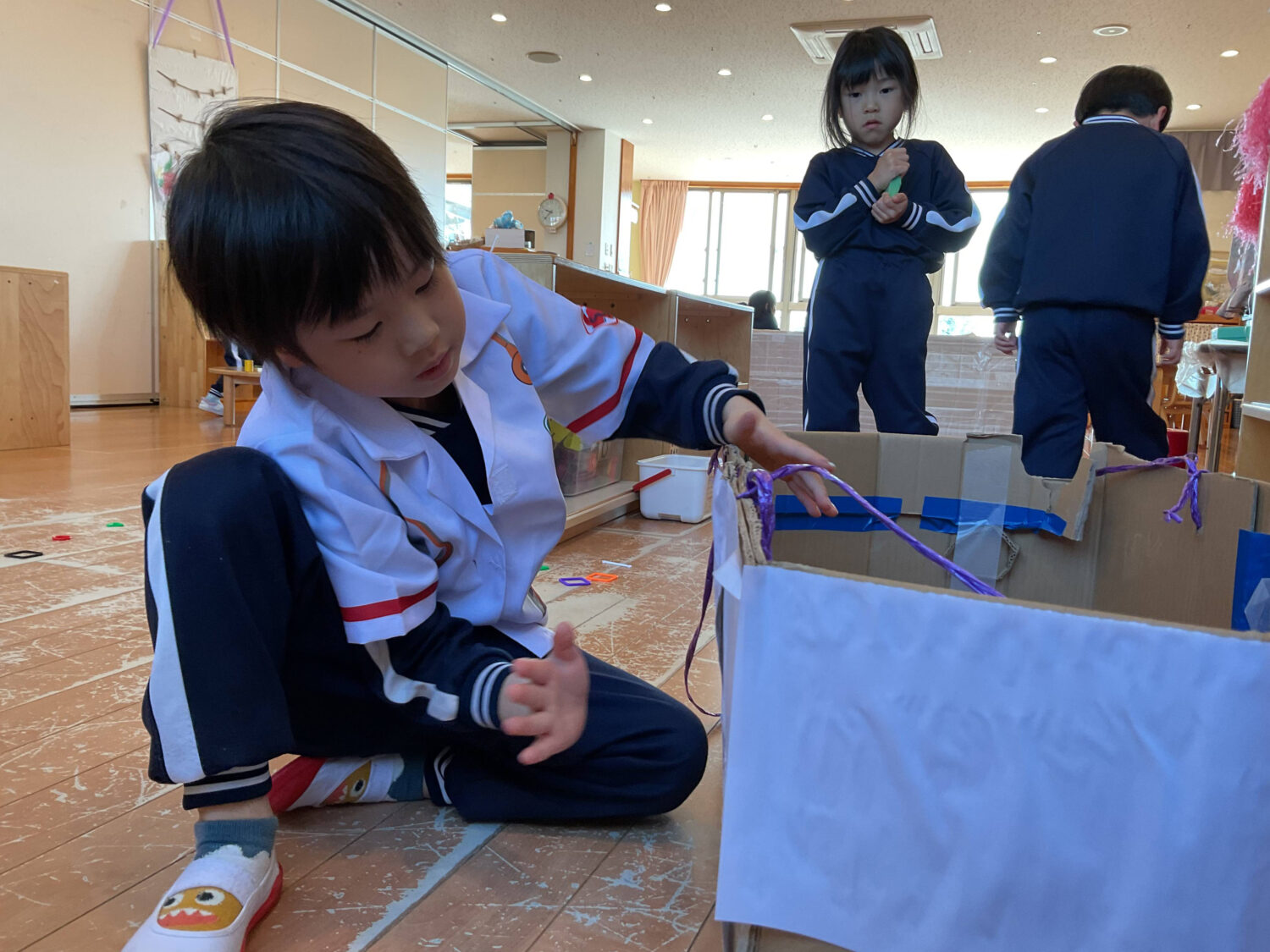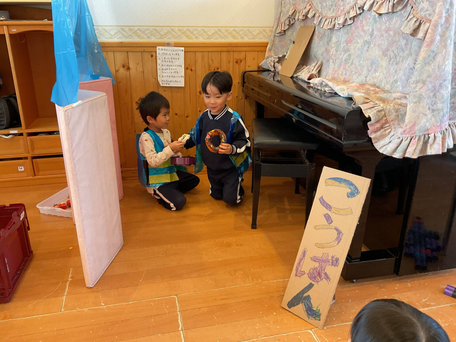 病院ごっこの盛り上がりを見て、警察になりきっていた男の子達も、「交番が欲しいな〜」と相談をしてきました。