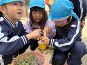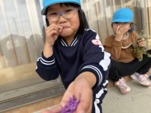 「私たちはたくさん潰して色水作るんだ〜!いいアイディアでしょ😆」