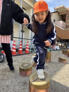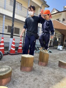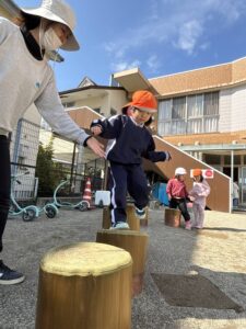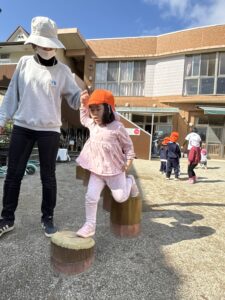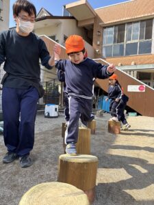 初めは手をつないで渡っていってましたが、何度もやっていくうちに、一人で挑戦する姿も見られました。