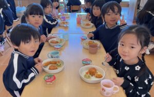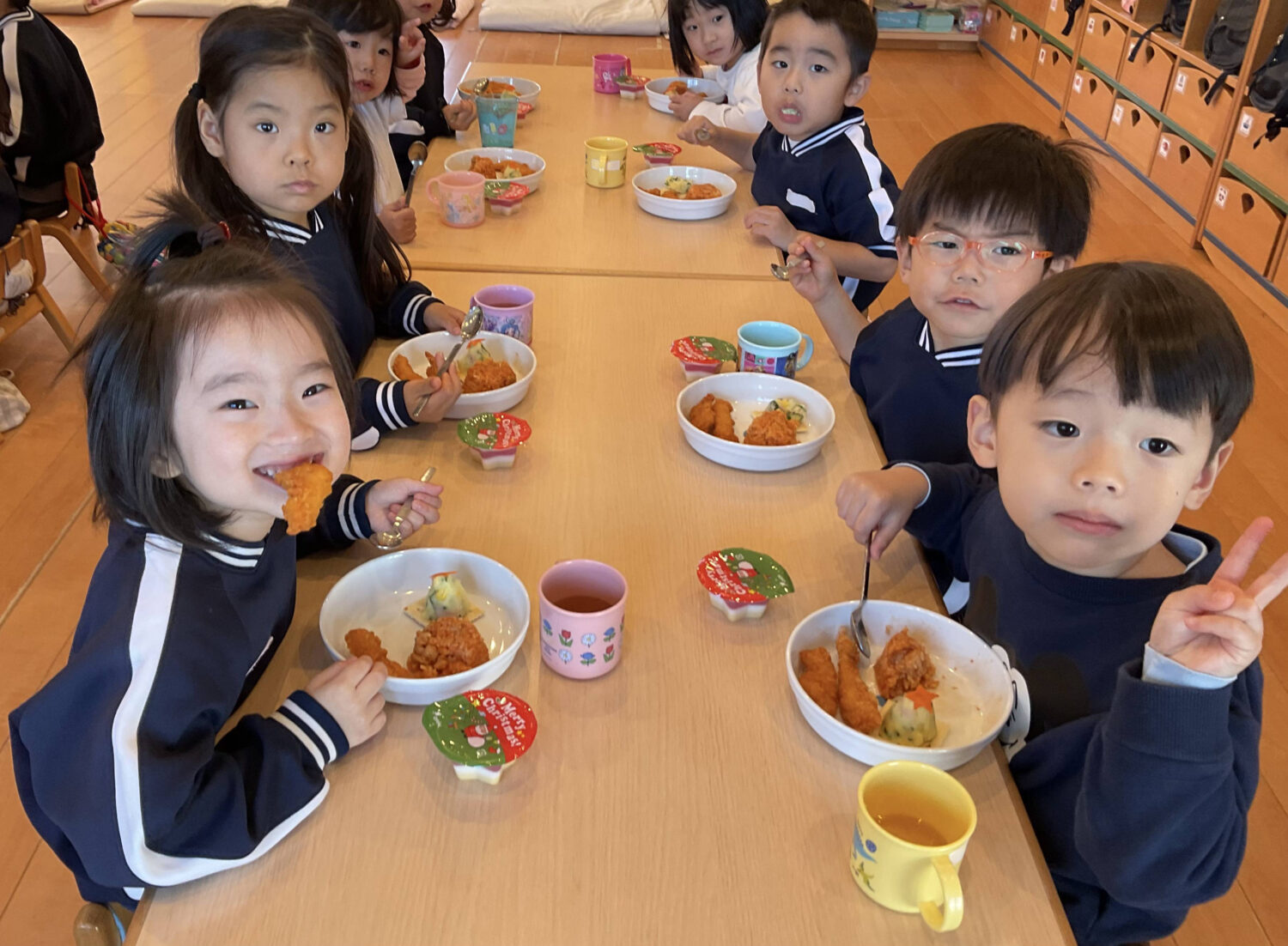 みんなで同じテーブルに座っての給食…🍗🍤