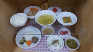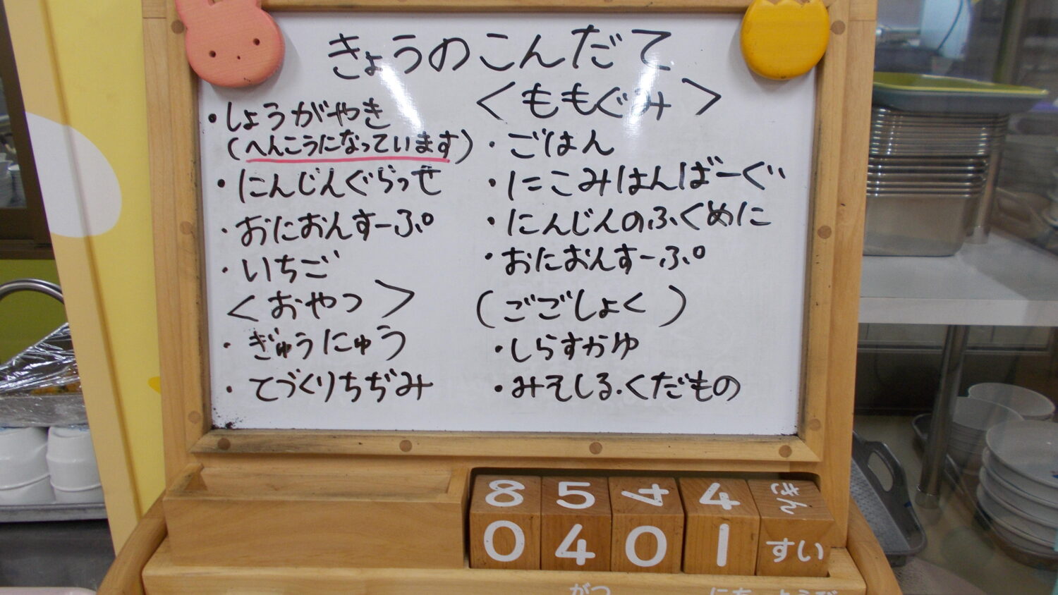 献立に変更があります。材料の都合上により、照り焼きハンバーグが豚肉の生姜焼きに変更になっています。
