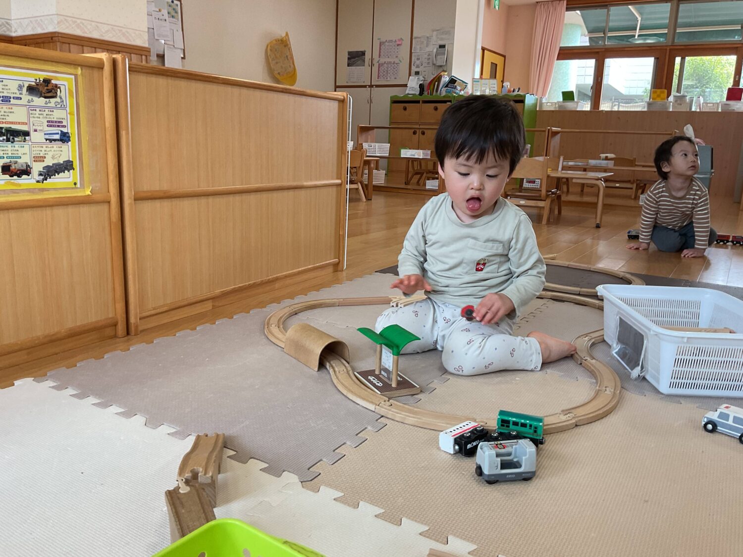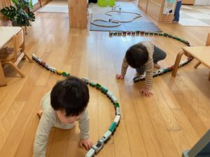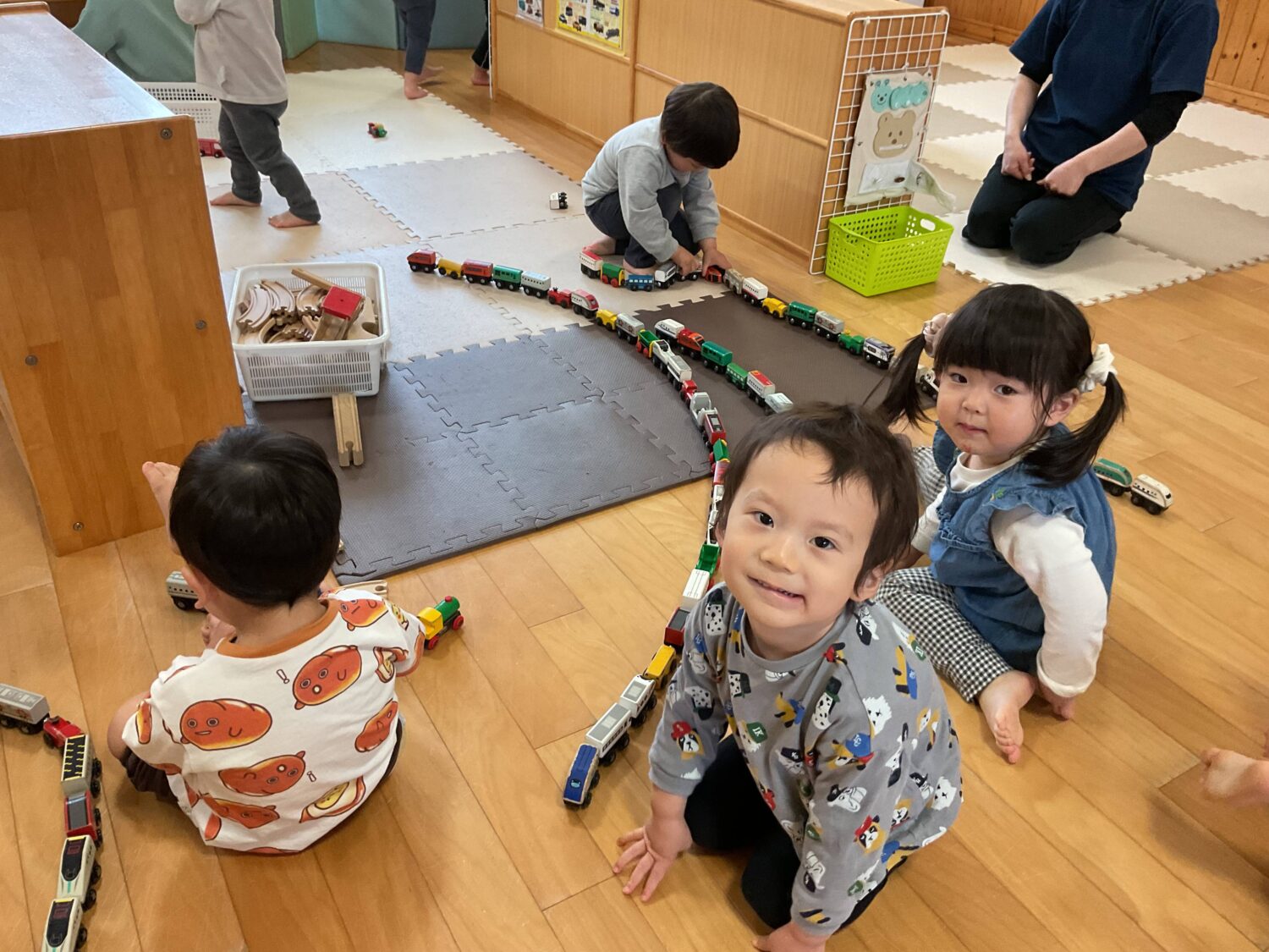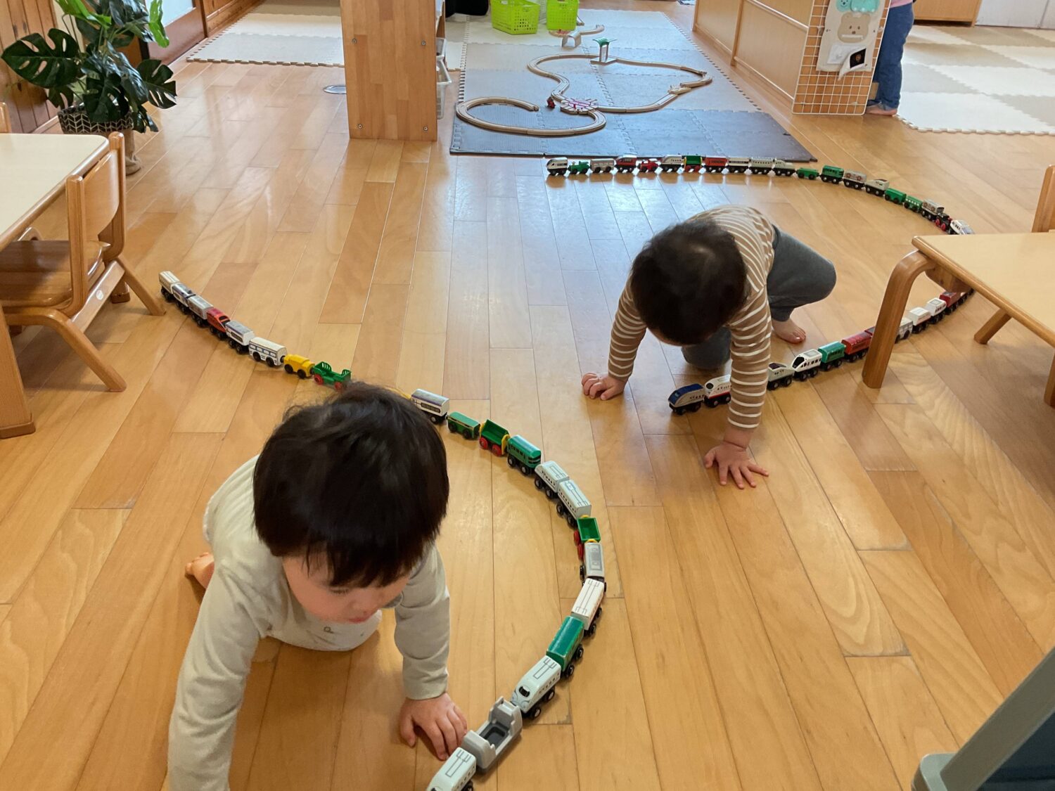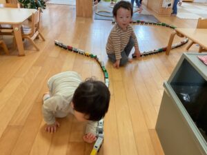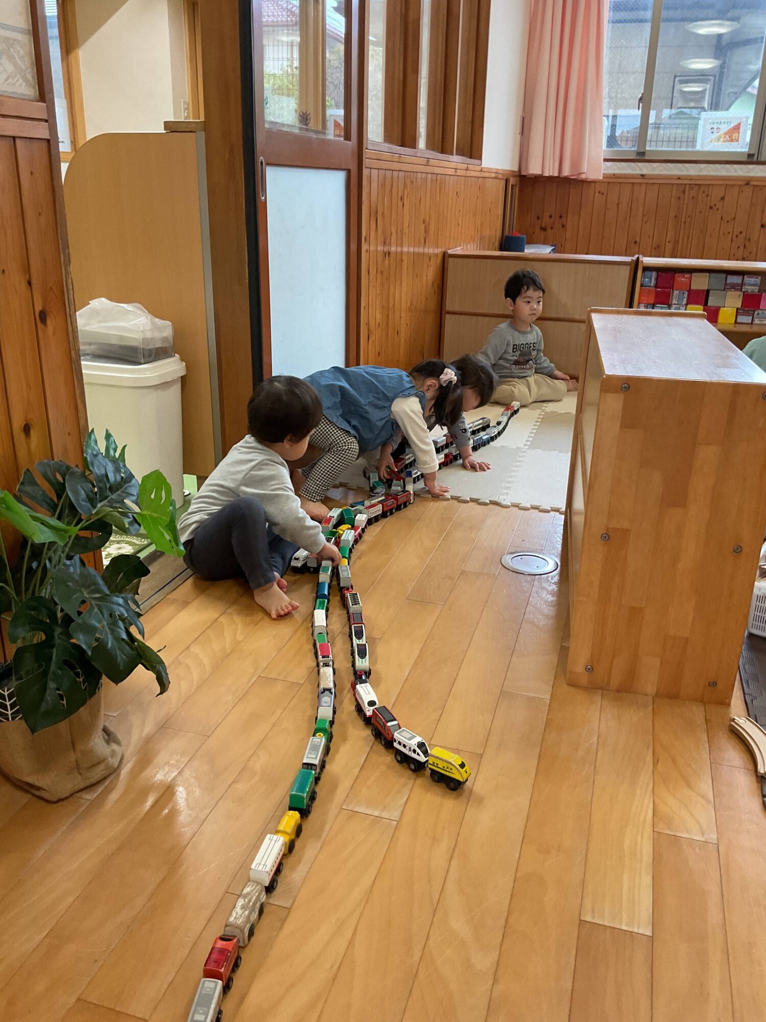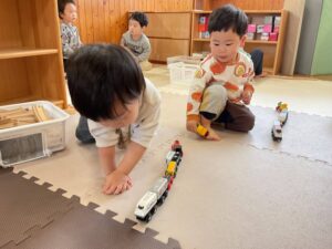それを見ていた子も電車を持ってきて新たな電車遊びが広がります。😊