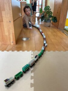 最初に線路をつないでいた子は、今度は線路ではなく、列車そのものを長くつなげ始めました。