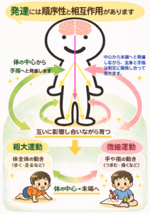 子どもは、まずは肩や腕、脚などをはじめとして、体全体を使って大きな動きをするようになり(粗大運動)…