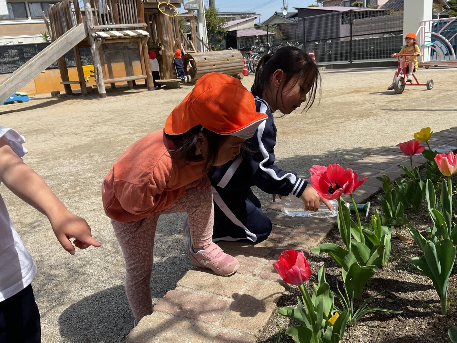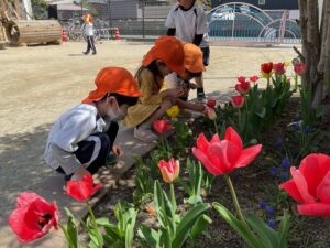 園庭には ちゅうりっぷが綺麗に咲き、自然と「さいた〜さいた〜ちゅうりっぷのはなが〜🎵」を歌うお友だち😊