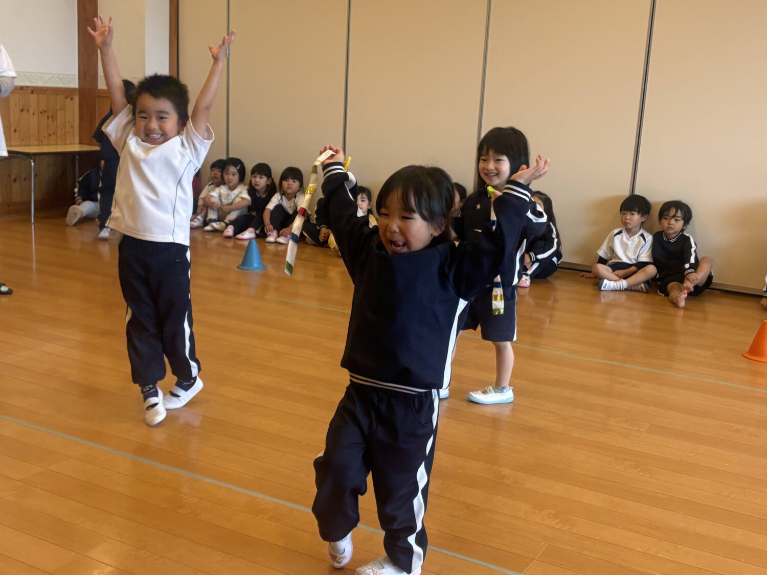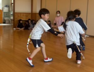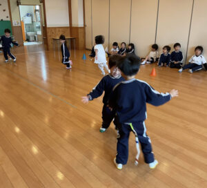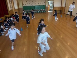 初めてしっぽ取りゲーム、みんな同じ方向に走り、なんだかお魚の群れのようなばらぐみさんでした😆笑