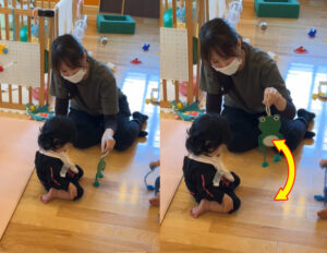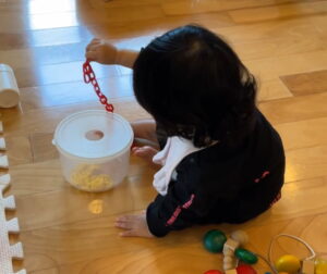 目で見て物を操作する…「目と手の協応動作」と言われるこうしたスキルは、将来的にスプーンや箸を使って 自分で食事がとれるようになる等…さまざまなスキル獲得へとつながっていきます。