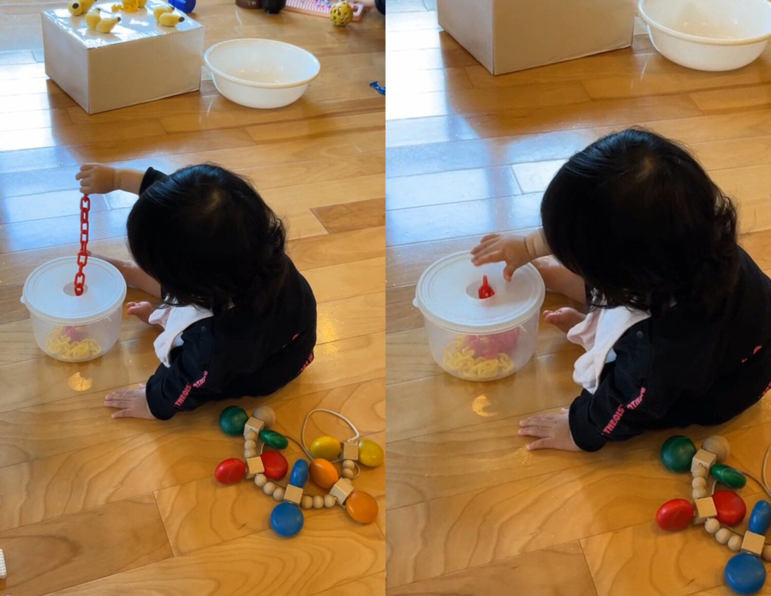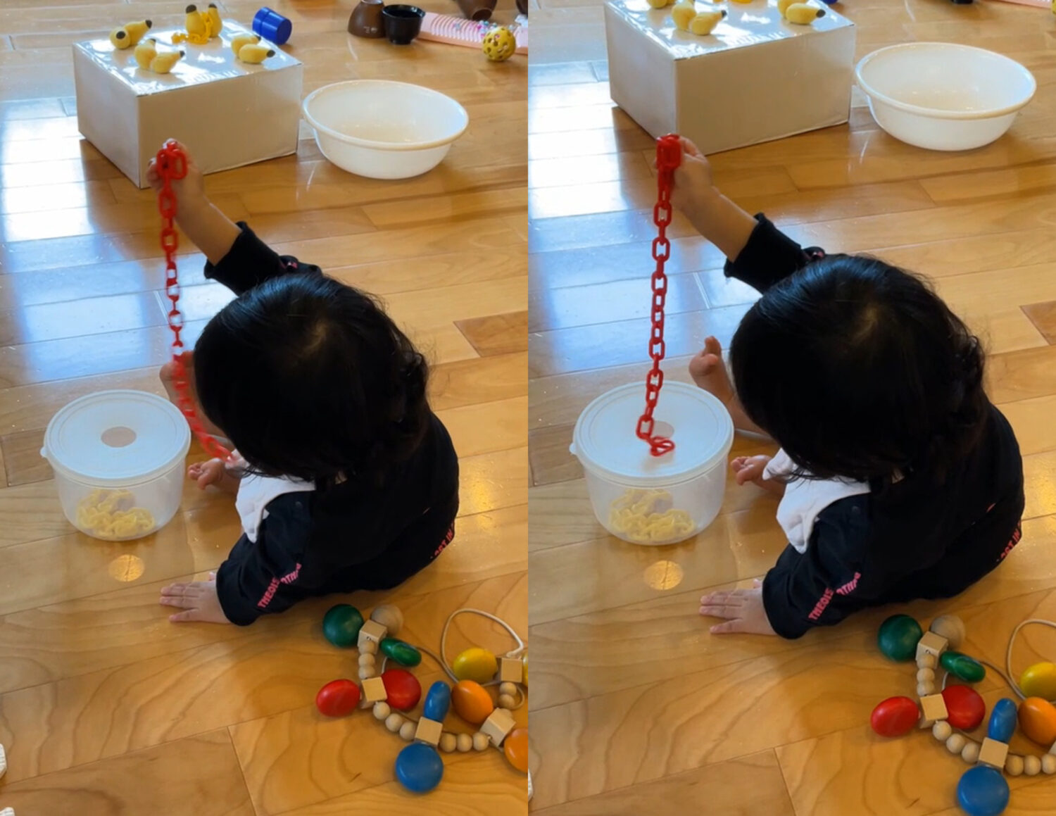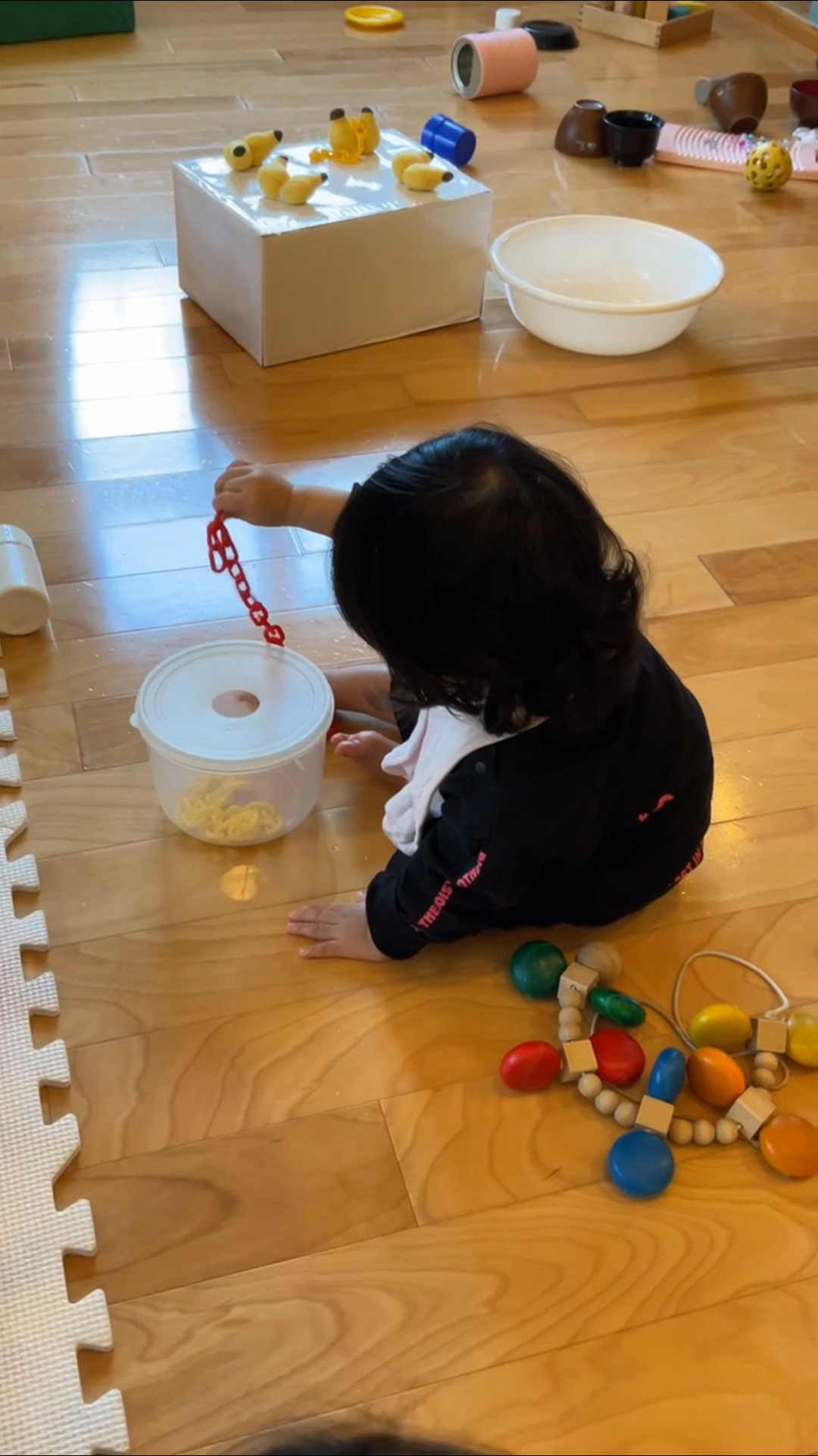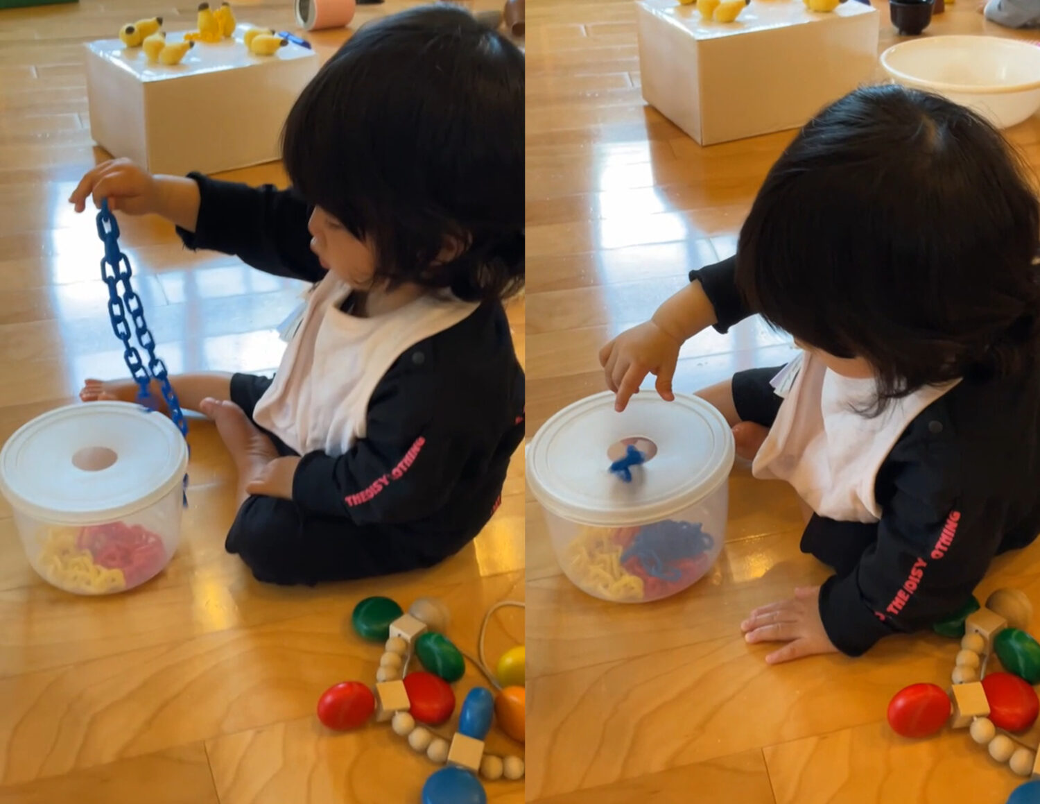 この子は、穴の開いた容器にカラーチェーンを入れようとしています。