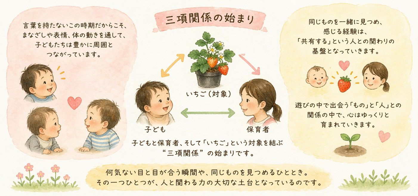 これは、子どもと保育者、そして「いちご」という対象を結ぶ“三項関係”の始まりです。