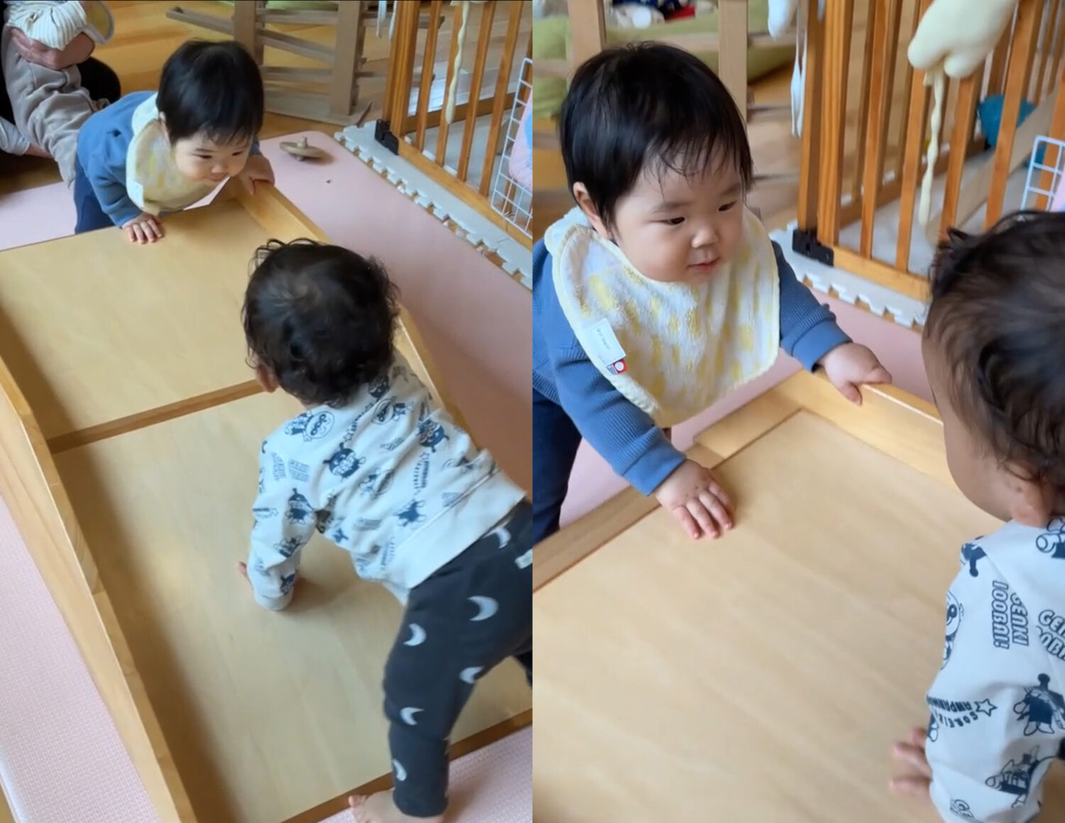 おもしろいのは、片方の子が滑り台を登ると、もう片方の子も後を追おうとします。