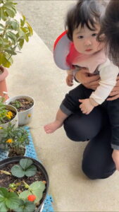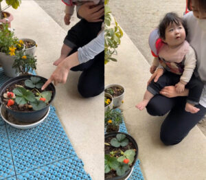 園庭で 保育者と一緒にいちごを見ている場面で…