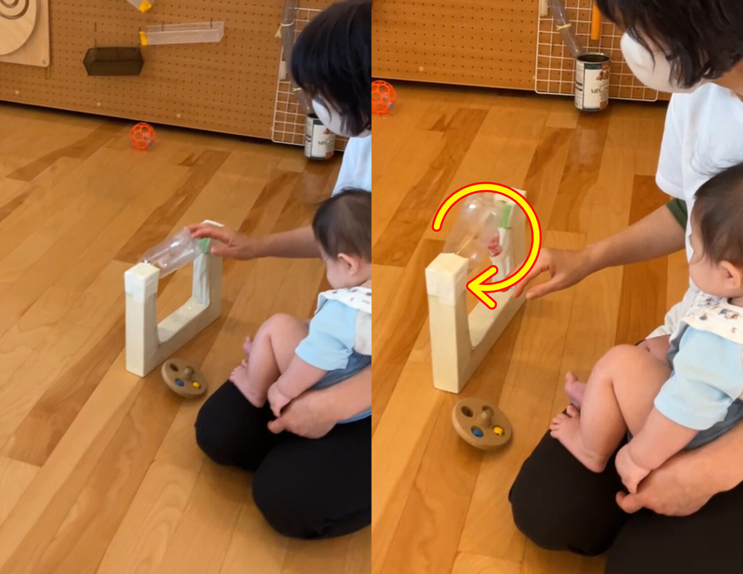 手づくりの回転遊具を回すと、回転するペットボトルをじっと見つめています。
