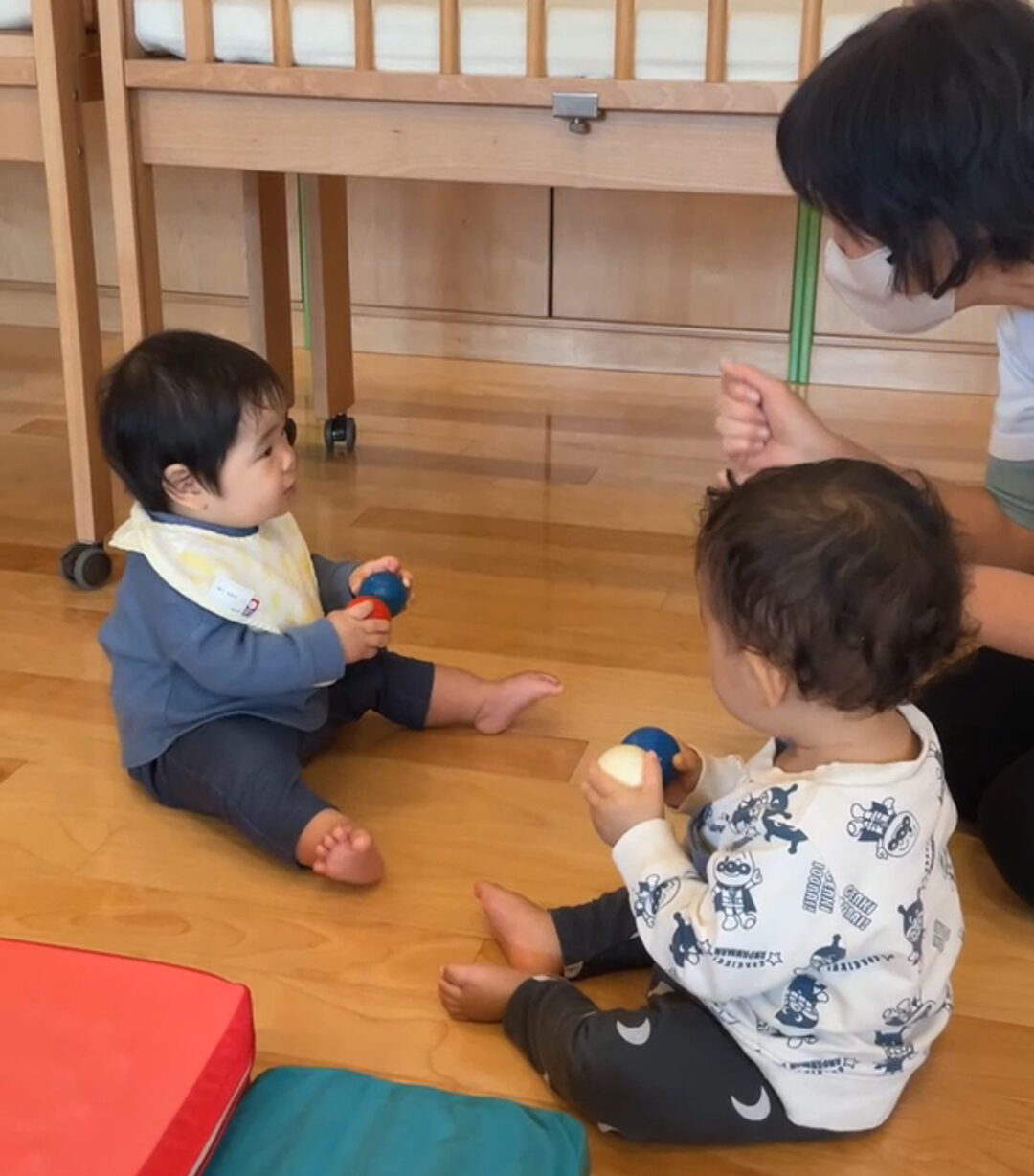 保育者の呼びかけに振り向くと、そこにはカラフルなボールが…