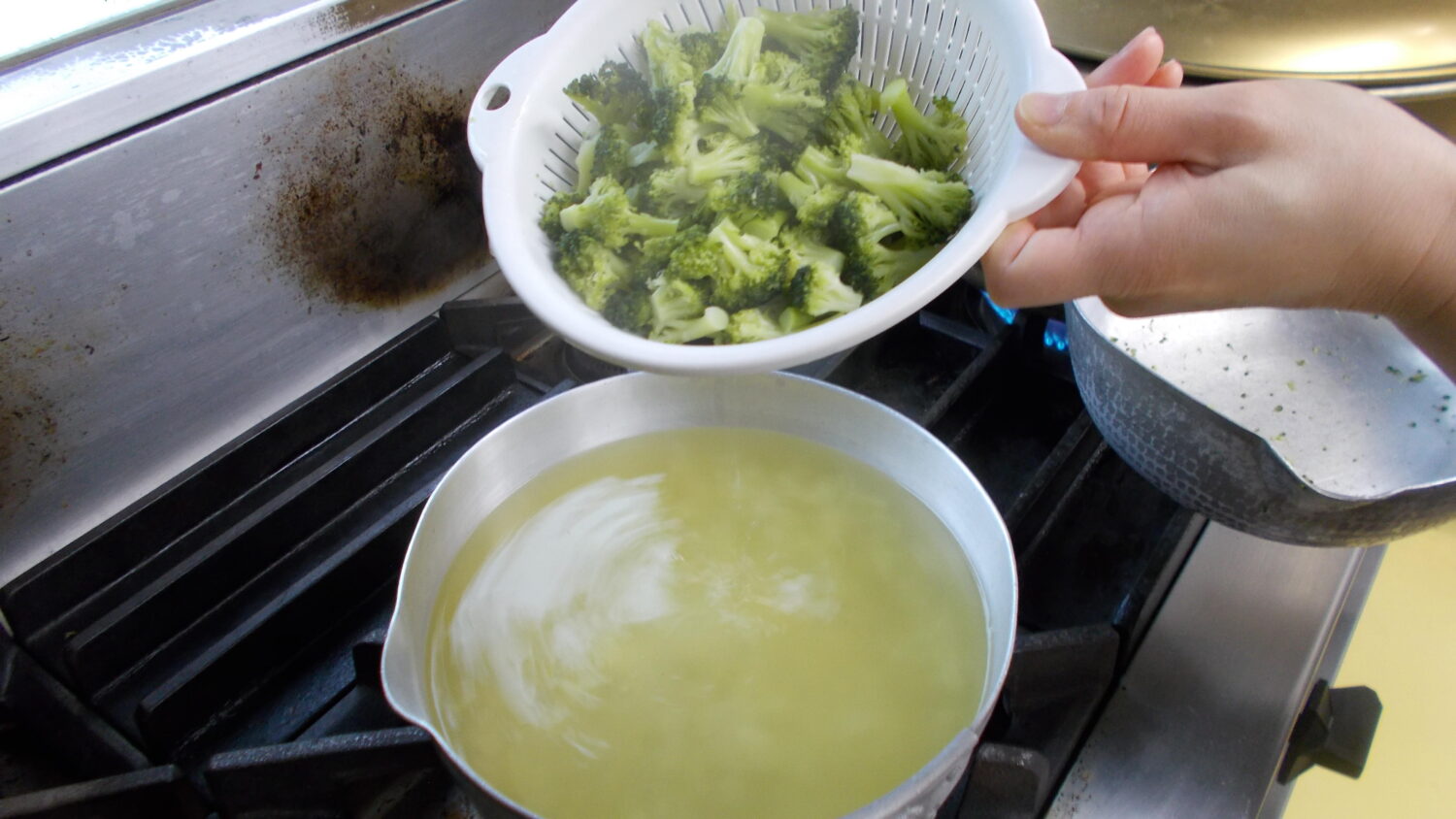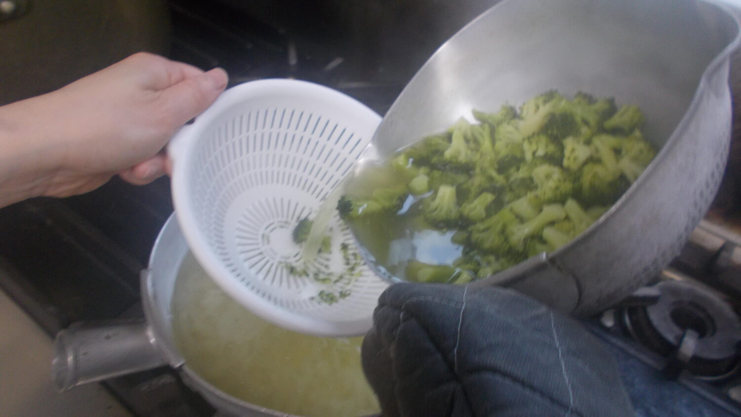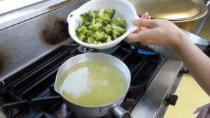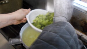 ブロッコリーがやわらかくなったらザルにかえすのですが、このときにさらに美味しくするポイントがあります❕