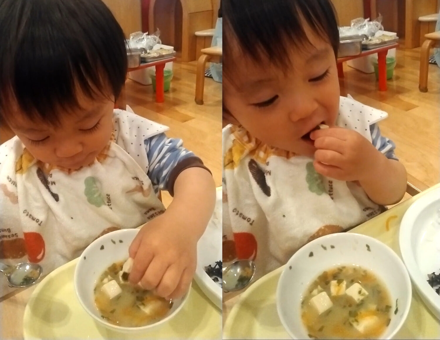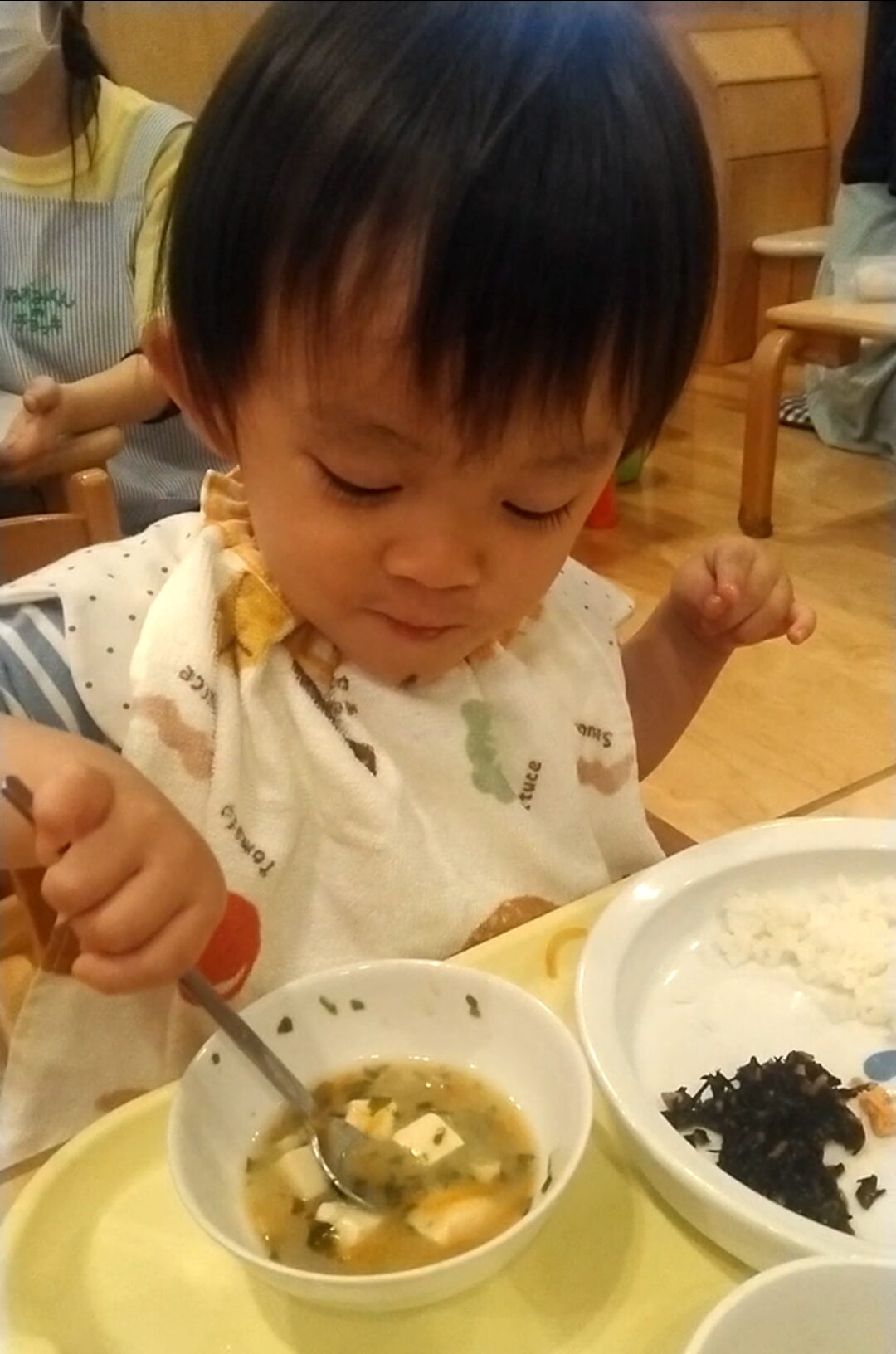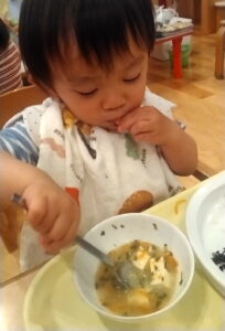 この子は スプーンを使って豆腐をすくおうとしていますが、なかなか難しそうです。
