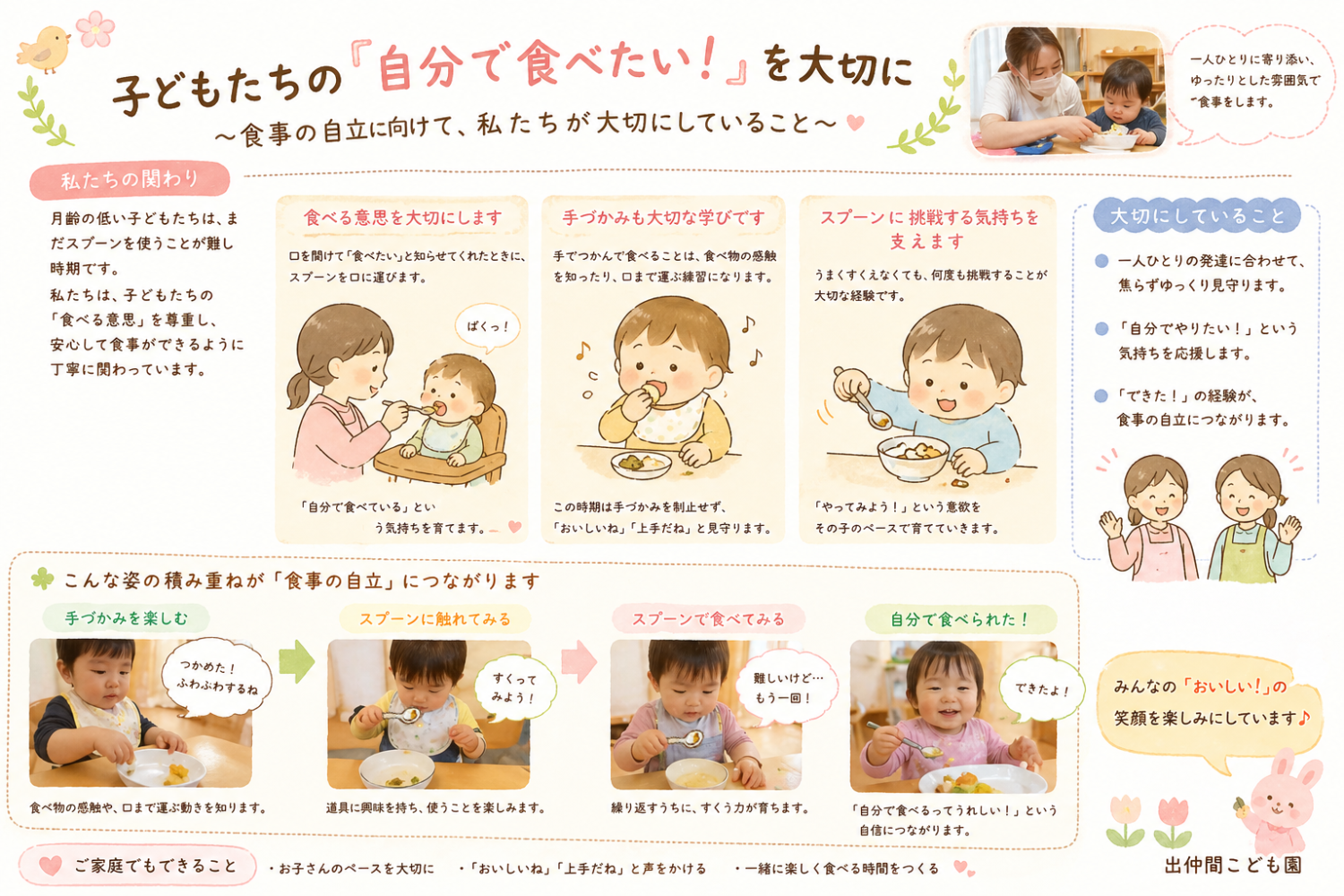 なのであせらずに、こうした「自分で食べたい」という意欲を尊重しながら、食事の自立へ向けて 成長の後押しをしていければと思います。