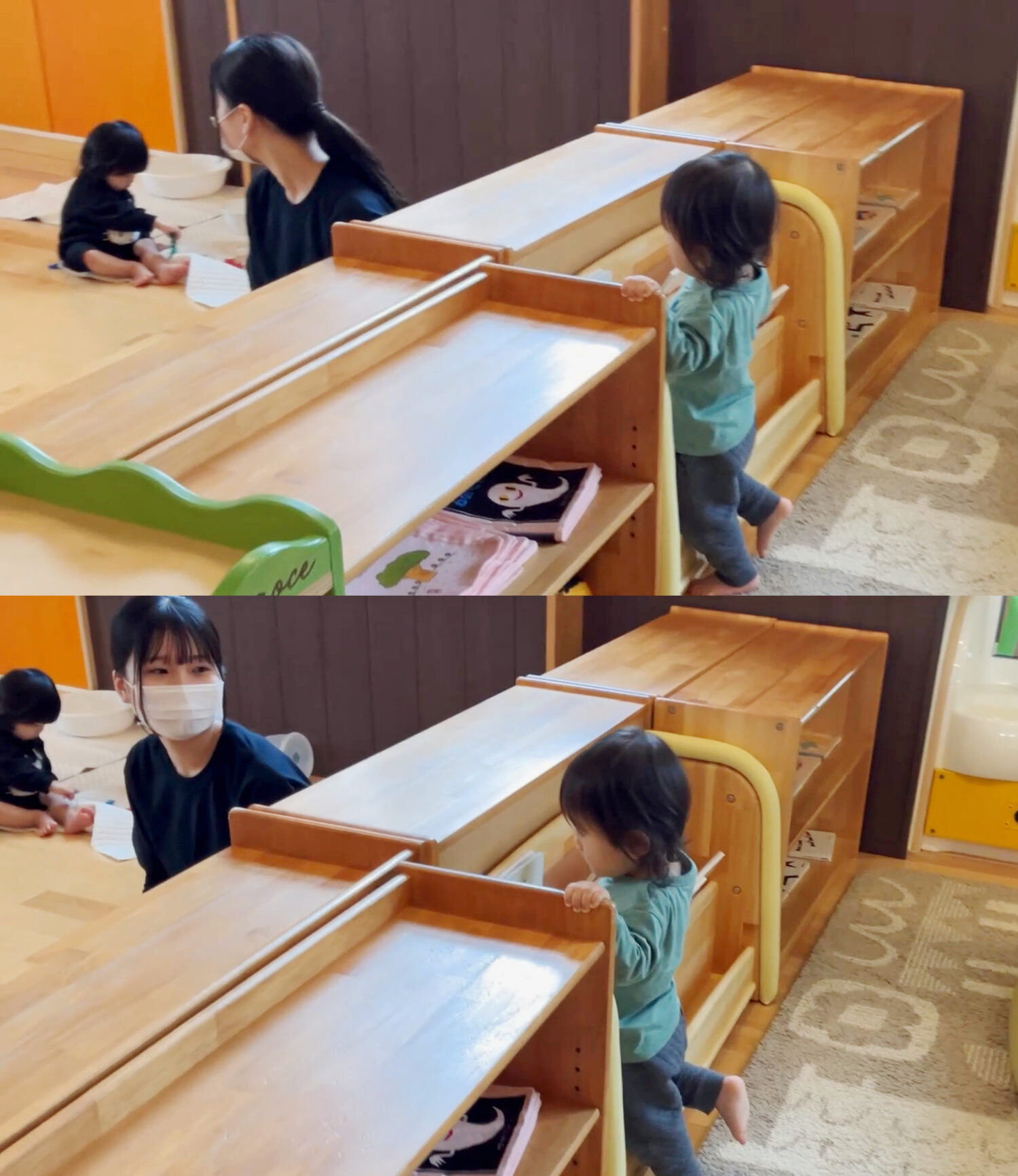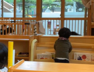 んっ?お隣のお部屋との仕切り棚から、もも組さんを覗いている子がいますよ😮