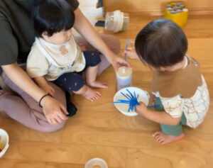 お互いに向かい合っておままごと遊びをしていると、相手の子がレンゲを使ってカラーチェーンをすくおうとしています。