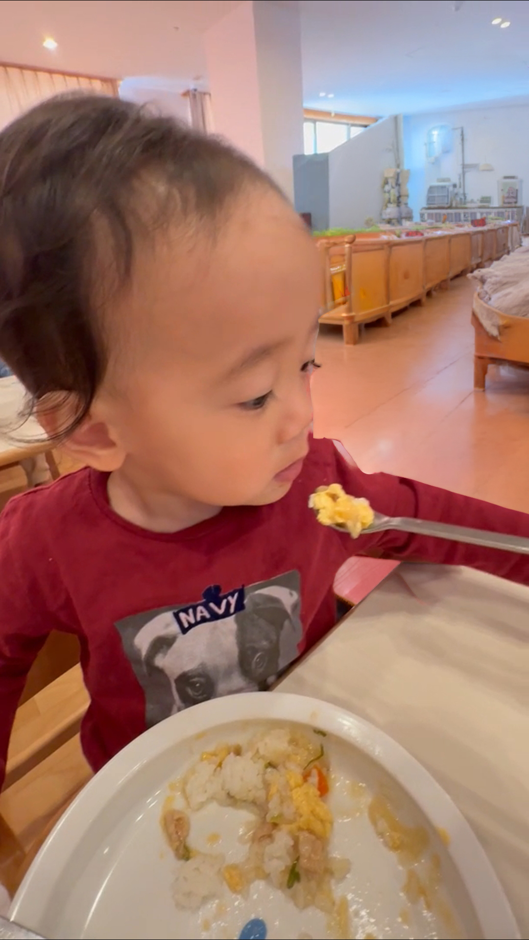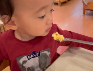手づかみで食べた後でも、本人は何とかスプーンを使って食べようと試みていますね。☝🏻👩🏻