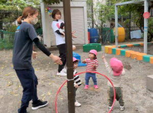 保育者が仲介することにより、いろいろな子どもたちと一緒に遊べる雰囲気も醸成されています。